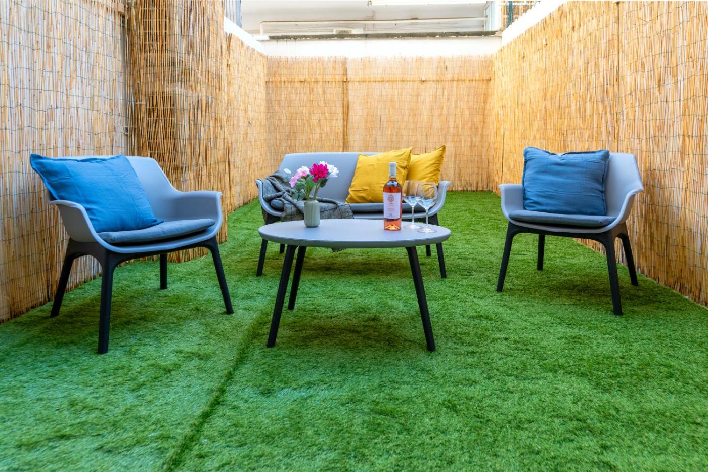 The apartment has 2 bedrooms, 1 bathroom, bed linen, towels, a flat-screen TV with streaming services, a dining area, a fully equipped kitchen, and a patio withcourtyard views. The unit has soundproofing and a bidet. The property has an outdoor dining area.
