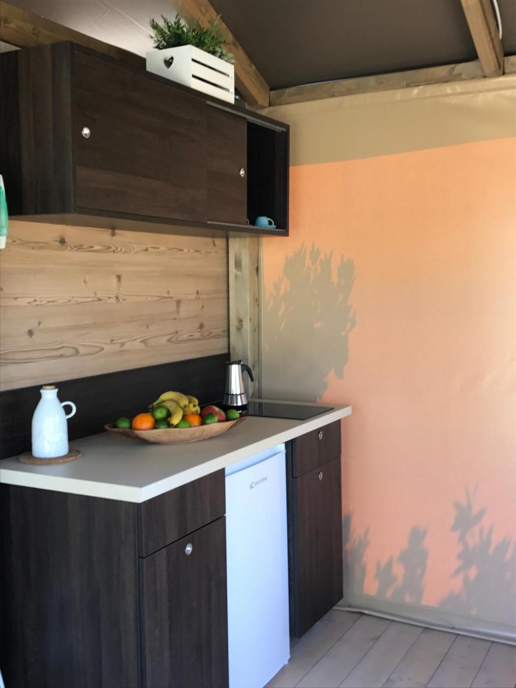 Tent. This glamping tent features a fridge, wardrobe and a shared bathroom.
