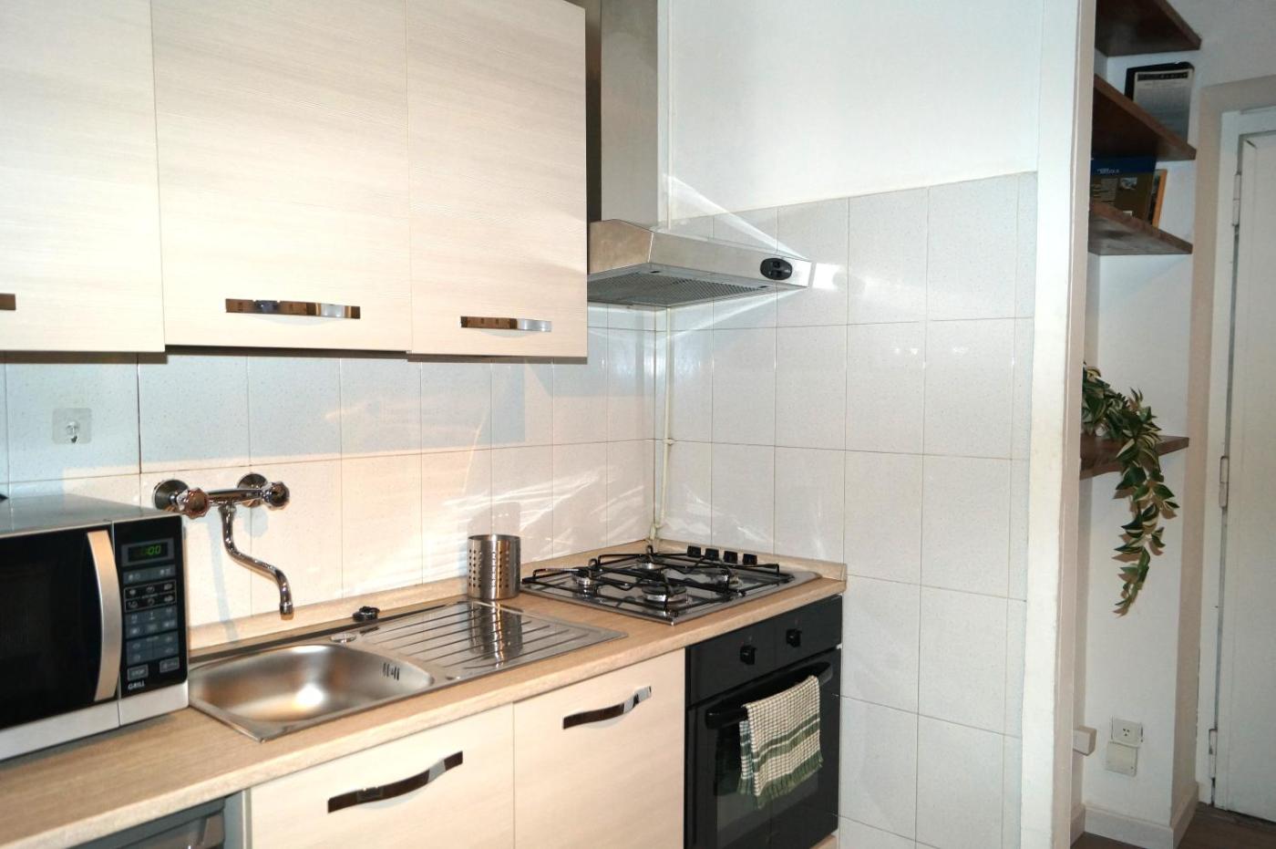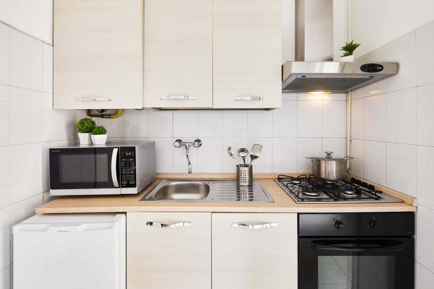 One-Bedroom Apartment. The air-conditioned apartment has 1 bedroom and 1 bathroom with a shower and a bidet. Guests can make meals in the kitchen that features a stovetop, a refrigerator and an oven. The apartment features a washing machine, a coffee machine, a dining area, a flat-screen TV, as well as ancourtyard view. The unit has 1 bed.