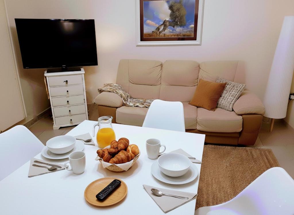 The holiday home has 2 bedrooms, 1 bathroom, bed linen, towels, a flat-screen TV, a dining area, a fully equipped kitchen, and a balcony with city views. This holiday home is allergy-free and soundproof.